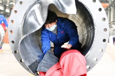 19日,在咸安经济开发区华宁防腐科技产业园衬胶车间,衬胶技术骨干冯友华正在钢结构做衬胶。
