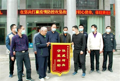 本报讯 记者夏咸芳、通讯员陈明、雷正报道:“廖董事长你好,谢谢振宁押运公司和公司党员志愿服务队34天来对我们龙泉佳苑小区疫情防控工作的付出和支助,我们龙泉佳苑党支部4名支委今天代表小区352户、1251位居民特地送上锦旗表达感激情……”3月24日上午,温泉十六潭社区龙泉佳苑小区党支部书记李万定等一行四人专程来到市振宁押运公司,将一面绣有“休戚与共、守望相助”的锦旗送到公司党支部书记、董事长兼总经理廖建辉的手中,感谢振宁押运公司党员志愿服务队在疫情期间对小区的无私奉献和有力援助。
