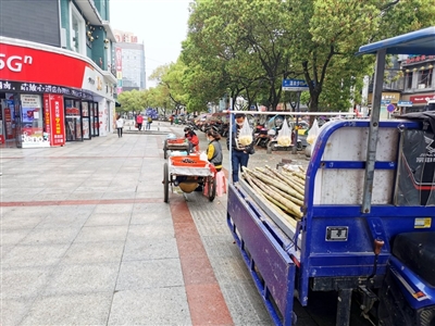 60多岁的李爹爹常年开着三轮车在城区各处卖水果,这几天在卖甘蔗,在小区门口卖了一会儿后他又来到中商百货附近。李爹爹说,现在街上人少,生意没有以往好。