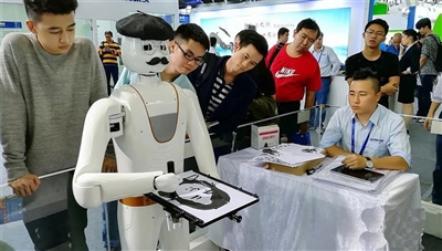 近日,机器人在为一名参观者绘制人脸图像。当日,在深圳举行的第十九届中国国际高新技术成果交易会上,深圳市智能机器人研究院展出的一款智能识别机器人,现场免费为观众绘制人脸图像。 (本报综合)