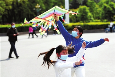 6日,市人民广场,一对母女在温暖的春风中放飞风筝。