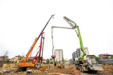 施工现场,工人们正在紧锣密鼓施工,拉土方的卡车来回穿梭,现场机声隆隆,吊机长臂挥舞,一场 “速度与激情” 正在上演。