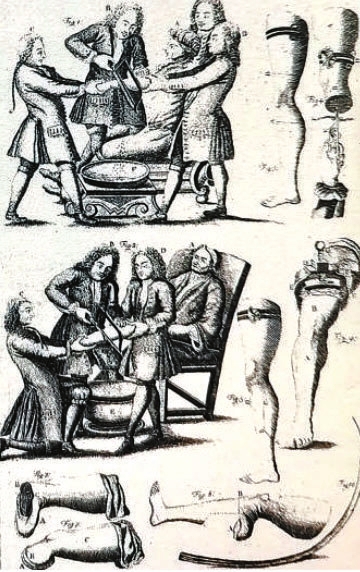 当药物不能保证患者或不能保证人类的健康和生命时,手术便推到了医学的前台。如“荒”书所说:“手术要突破最后的终极障碍——人体本身。割开皮肤,穿透眼球,锯掉骨头,结扎血管,这意味着自然与疾病、创伤的演变历史正在改变。”从华佗与关羽剔骨疗伤来看,从古至今,手术就是医疗的重要手段,也是医学史必须面对的话题。从关羽剔骨疗伤的三世纪,一直到十九世纪,可靠的麻药还未出现。于是有了铮铮铁骨的关羽的英雄形象——“荒”书的作者可能不知道这一故事。在欧洲用器械给病人手术的事,确实是一部人类或个体病人疼痛的历史。十八世纪,医生用专门做的弯刀或锯子,给病人切骨头和锯骨头。手术的步骤是,刀切开骨头外的皮肤、肌肉,然后用锯把骨头锯开或锯断。流的血用灼术(热铁、沸油等)来处理,肌肉要么不处理,也可缝合起来。据说,那时著名的医生是比在同一时间内,可以切开或锯开骨头的数量。一位名叫本杰明·贝尔的苏格兰医生,可以在六秒之内截断一个大腿。法国医生让·拉雷在拿破仑战争期间,24小时内完成了200次截肢。法国医生截肢总数肯定会得第一名,但速度却比那位苏格兰医生慢了一秒。还有一位叫利斯顿的苏格兰医生更神奇,他在讲课时,截了一只骨头后,把刀叼在牙子中间,冲着他的学生和围观者大声叫道:“先生们,给我计时!先生们!给我计时!”这哪里是在治病,这是在当演员——切骨头或锯骨头的超级演员!这哪里管得上患者的疼痛,这是在扮演某种神力最为荒诞最为糟糕的悲喜剧。好在那时没有影像留下来,如果留了下来,这岂不是我们人类在走向文明和走向理智时的最野蛮行为吗!但正因为有了这样的代价,才有了现代医学上的诸如术前准备、无菌、麻醉、现代器械下的手术和术后护理等等。特别是因为一代更比一代先进的手术器具,也才有了现代手术的理念:无痛、速愈。