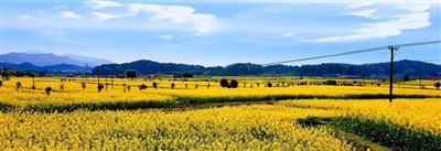 通城县塘湖镇狼荷村油菜花田与田埂交错,被村庄包围。成片的金黄色油菜花与粉墙黛瓦的民居组成一幅幅美丽的春日画卷,吸引无数游人踏春赏花。春风吹过,花浪滚滚,芬芳飘然而至。