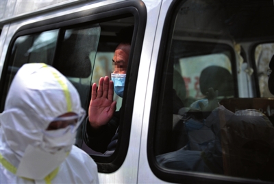 4月13日,在武汉长江新城康复驿站,康复隔离人员与工作人员告别。