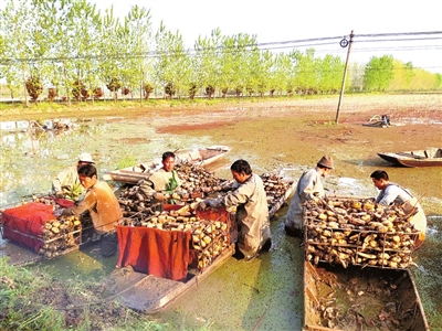 4月10日,嘉鱼县陆溪镇官洲村的莲藕基地,30位工人正在忙着挖藕。岸边一筐筐刚采挖的莲藕正在装车。“一天可以挖五六万斤。”该基地经营户孙兵成介绍,前段时间受疫情影响,莲藕销售量有所减少。随着疫情形势持续向好,销量持续回升。该基地的莲藕主要销往东南亚一些国家,预计今年产量可达1500万斤,产值3000万。