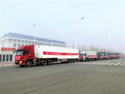 2月11日下午3时许,5辆满载抗击新冠肺炎疫情防控总价值1276.8万元物资的货车,从秦皇岛出发;