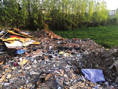 【记者暗访】4月14日下午6时许,记者来到咸宁绿地工地,经过一番走访发现,位于咸宁绿地售楼部右侧马路右边一处花坛绿化带堆积着建筑垃圾,不远处的围墙下还有少许生活垃圾。