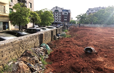 记者看到,沿着路边的空地上,已经建起了半人高的新围墙。从预留的大门走进去,看到之前的菜地已被清理,裸露的垃圾已不见踪影,偌大的一片空地已被平整完毕,仅有一小块菜地里还冒着新芽。在空地的最里面,围墙一角有一个缺口,几位工作人员正在进行围墙地梁混凝土施工。