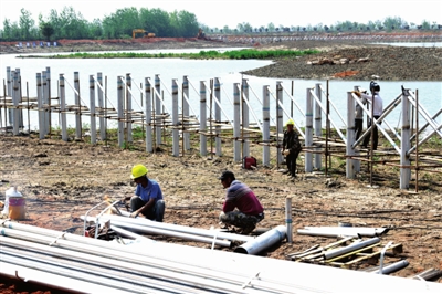 16日,向阳湖国家湿地公园水生植物园工程现场,施工人员正在进行深水区步行栈道钢结构施工和观景平台防腐木铺设。