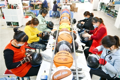 通城县辉隆体育用品有限公司不因疫情影响,产品销售不降反升,员工加班加点赶制外贸订单。