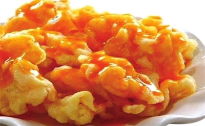 取一圆盘,将炸好的肉片均匀的一层层铺在盘子上做花瓣状,用细细的姜丝做花蕊,然后浇上糯米酒、番茄酱烧至浓稠的酱汁,一道色泽美观的芙蓉肉便做好了。
