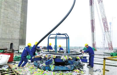 4月20日上午9时许,赤壁江畔,烟雨朦胧。随着现场指挥人员一声令下,塔吊吊钩缓缓升空,一条长96.492米,重达6.40吨的“长龙”蜿蜒腾空而起,一端“穿针引线”地安装在塔端1号索道管内再脱空展索。