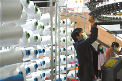 10日,嘉鱼县经济开发区吉扬日用品有限公司生产车间,技术员在大圆机上接线。