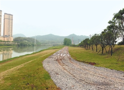 当日上午9时15分,龙潭新桥旁杰士邦地块,阳光照耀下,铺设的草皮鲜绿,新栽的苗木舒展,一条碎石子路,沿着淦河蜿蜒。