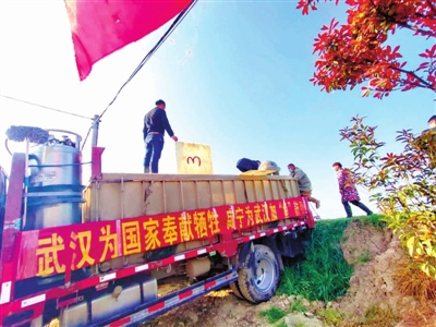 3月19日,停靠在潘家湾镇头墩农场东湖生产队旁的8辆大卡车已经装满了刚刚捕捞起来的鲜鱼,车身上的横幅醒目的写着,“咸宁为武汉加‘鱼’鼓劲”“武汉咸宁一家亲、携手抗疫心连心”。