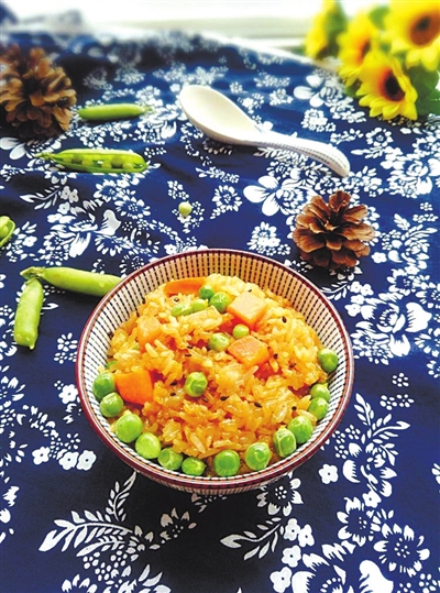 在老家,豌豆糯米饭又叫“豆儿饭”。童年记忆里,奶奶会亲手剥出最新鲜的豌豆,和糯米、腊肉一起在灶头大铁锅里翻炒至出香气,还可以放入炒散的鸡蛋,无需过多酱料配菜,单吃饭就很美味。每次吃豆饭,我总要吃上两大碗才满足。
