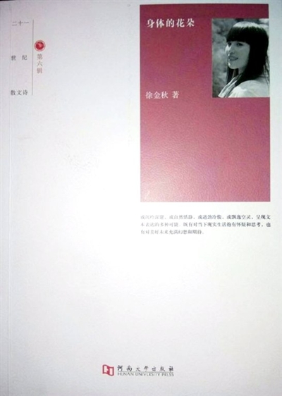 《身体的花朵》散文诗集,由河南大学出版社出版发行,是徐金秋继散文集《长箫短笛》选入湖北省作协“三人行”文学丛书后的又一部力作。该书列入“21世纪散文诗”丛书第六辑,收录2015至2017年百多章作品,分为五辑。