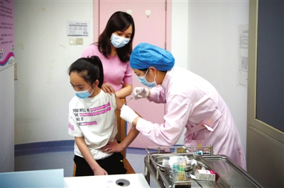 5月18日,在湖北省妇幼保健院,护士为一名来自武汉的女孩注射国产HPV疫苗。