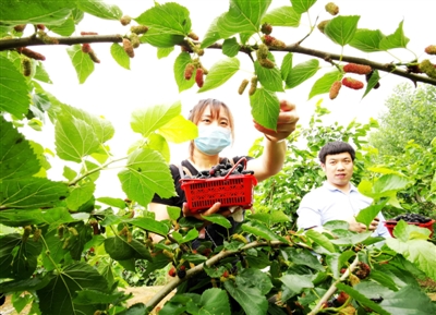 黄栗留鸣桑葚美,紫樱桃熟麦风凉。正值桑葚成熟,小麦收割时节,咸安区向阳湖镇宝塔村宝丰农庄游客络绎不绝,一颗颗饱满圆润的桑葚挂满枝头,令人垂涎欲滴,游客们体验着采桑葚、摘枇杷和自助烧烤的乐趣。
