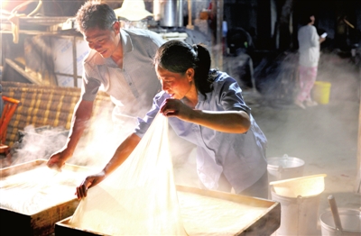 20日晚,崇阳县高枧乡中山村,杨仕典和黄连夫妻俩正在忙着打豆腐。夫妻俩本是金塘镇黄沙村人,2008年举家搬迁至这里做豆腐生意。