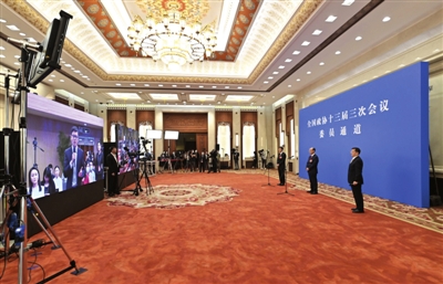 5月21日,在北京人民大会堂新闻发布厅举行全国政协十三届三次会议第一场“委员通道”采访活动。这是全国政协委员通过网络视频方式接受媒体采访。
