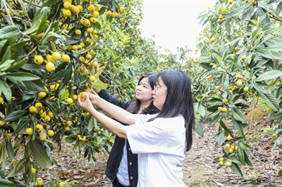 5月23日,笔者来到嘉华林果种植专业合作社,淡淡的果香满山飘溢,金黄、鲜嫩、丰腴的枇杷挂满了枝头。在绿叶的映衬下,显得尤为诱人,让人恨不得一跃而上,摘下这美味。而不少市民专程来到枇杷园,体验采摘的乐趣。
