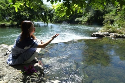5月下旬的通山县南林桥镇湄溪村港路河,河水倒映着两岸的绿和天空的蓝,农舍的红点缀在山林间,山林的浓绿被照得透亮。