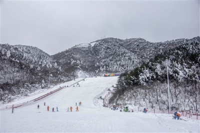 九宫山滑雪场是江南第一高山室外滑雪场,核心区位于九宫山铜鼓包区域,面积约6万平米,海拔1559米,垂直落差300米。该地雪粘度大, 雪质好,适合开展大众滑雪和竞技滑雪,采用人工造雪和天然雪相结合。整个滑雪场建成初级、中级雪道各一条,练习道一条,全套进口造雪设备。