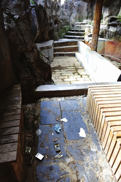 沿着石阶往下走,记者发现除了落叶、落花、尘土等,没有什么垃圾。然而,一进入露天温泉,里面的脏污就迎面而来,撞入眼帘。