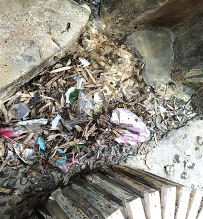 一个泡池里,到处都是烟头、纸屑、枯叶;另外一个泡池里,有烟盒、口罩、塑料瓶、破碎塑料等垃圾;一个角落里,长满了黑绿色的青苔,上面有个腐烂看不出原形的水果。