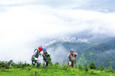 近日,国网崇阳县供电公司跑山电工在金塘镇畈上村,为该村生态旅游基地拓展供电范围。