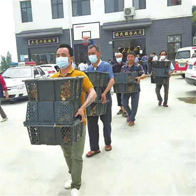 图为该局将第一批从嘉鱼购买的1500只鸡苗分发给村民。