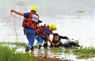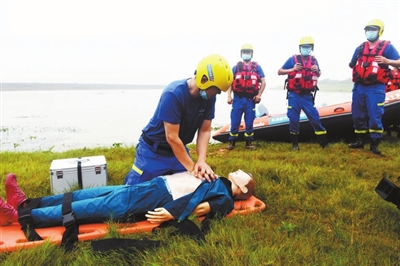 我市于6月进入主汛期。昨日,市住房和城乡建设局在大洲湖举行“安全生产月”启动仪式暨水上救援应急演练活动。