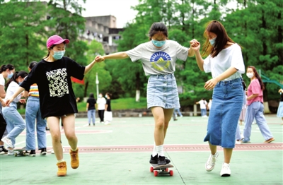 6月10日,湖北省恩施职业技术学院参加技能高考的学生在玩滑板。