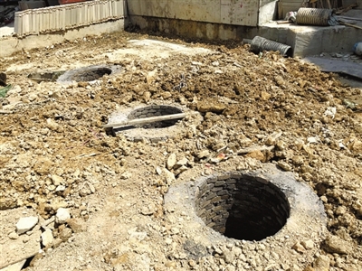 记者在该建筑工地转了一圈,发现几个深深的窖井,上面无井盖,旁边也无提示标识;建筑材料乱堆乱放,杂乱无序;道路上、建筑物里有大片污水;一次性餐盒、烟盒、塑料袋等垃圾随处可见。