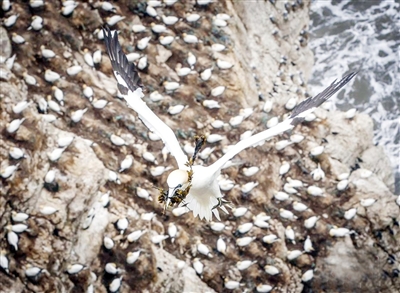 近日,在英国约克郡,塘鹅蜂拥至本普顿悬崖筑巢。从4月到8月,悬崖上到处都是筑巢的成年鸟类和小鸟。超过25万只海鸟聚集到悬崖上寻找配偶并繁育后代。
