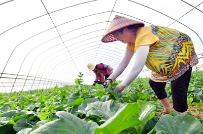 6月13日,赤壁市黄盖湖镇大湾村金海生态科技有限公司基地,当地农户正在甜瓜棚内梳理瓜藤。