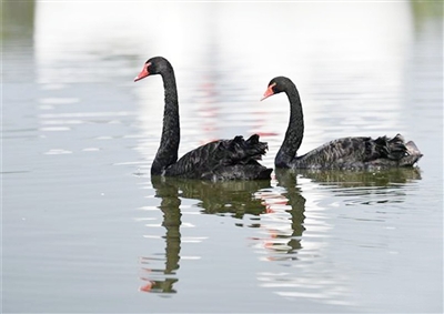 近日,山东省枣庄市台儿庄双龙湖湿地观鸟园,两只黑天鹅在水中游弋,相映成趣。