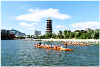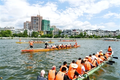 仲夏时节的隽水河,一泓绿水渺渺,两岸柳条依依,蓝天白云,虾戏鱼游,一条条龙舟飞快划过,当真是“舟行碧波上,人在画中游”。