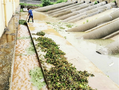 昨日,嘉鱼县簰洲湾镇后垸泵站正在进行人工清除拦污栅前的杂草和垃圾。该泵站从1日开始提前排水,安排工作人员24小时轮班值守,确保泵站能正常运行。图②