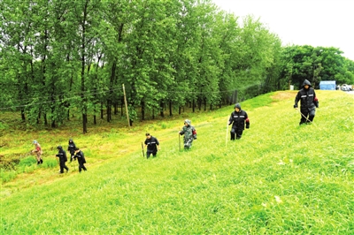 驻守在5号哨所的水务集团防汛人员披戴雨具,在5号哨所至4号哨所间的堤坝背坡下,用长木棍一字排出探查险情。据了解,该哨所值守人员已由四级响应时的6人增至30人,由市直单位10人和镇村20人组成。
