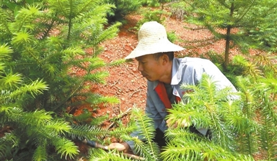 记者在花园村苗木基地看到,山丘上绿意浓浓,层层叠叠新栽种的杉树生机盎然,王义林正对苗木进行抚育。