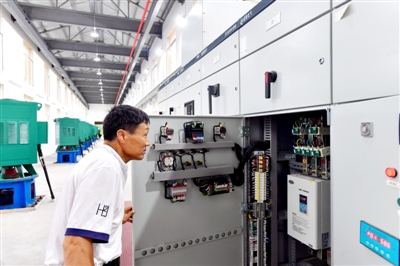 7月9日,嘉鱼县簰洲湾镇后垸电排站,13个机组全开抢排渍水,管理员耿显池定时查看抽水泵运行情况。