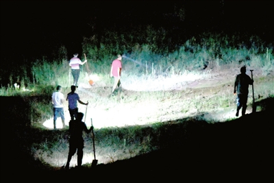 22:43分。在长江赤壁干堤11号哨所责任堤段,七束灯光在护堤林中闪耀。