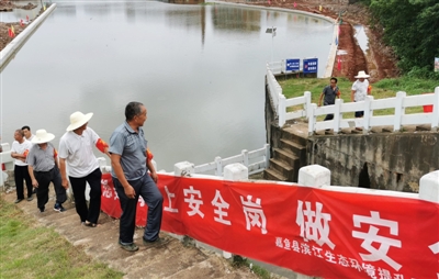 13日,在嘉鱼县鱼岳镇护城堤永逸闸下,几名防汛老兵仔细巡查闸室内边墙及护城干堤安全隐患。