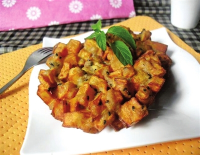 苕面窝色泽金黄,呈圆窝式,中间薄焦酥,边圈厚柔软,味正,香甜爽口。