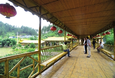 接待生活区:建筑现代化综合办公楼1栋,观光竹楼1幢,单层别墅3套。现已完成主体建设4000平方米接待中心以及观光竹楼,沿小溪修建人行道2公里。