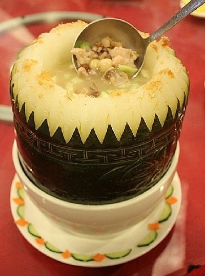 吴惠的做法是以香菇、火腿、牛蛙、鸭肾和高汤,放入冬瓜盅里文火炖足3小时,味道香醇而清甜,肉味浓郁。