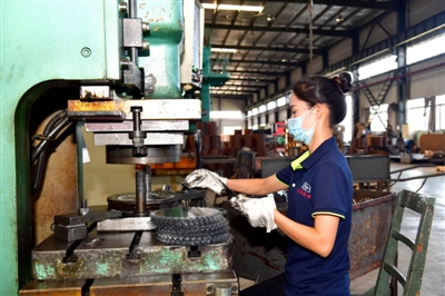 7月24日,咸宁高新区,湖北同发机电有限公司车间,工人们正在车床前加工零配件。